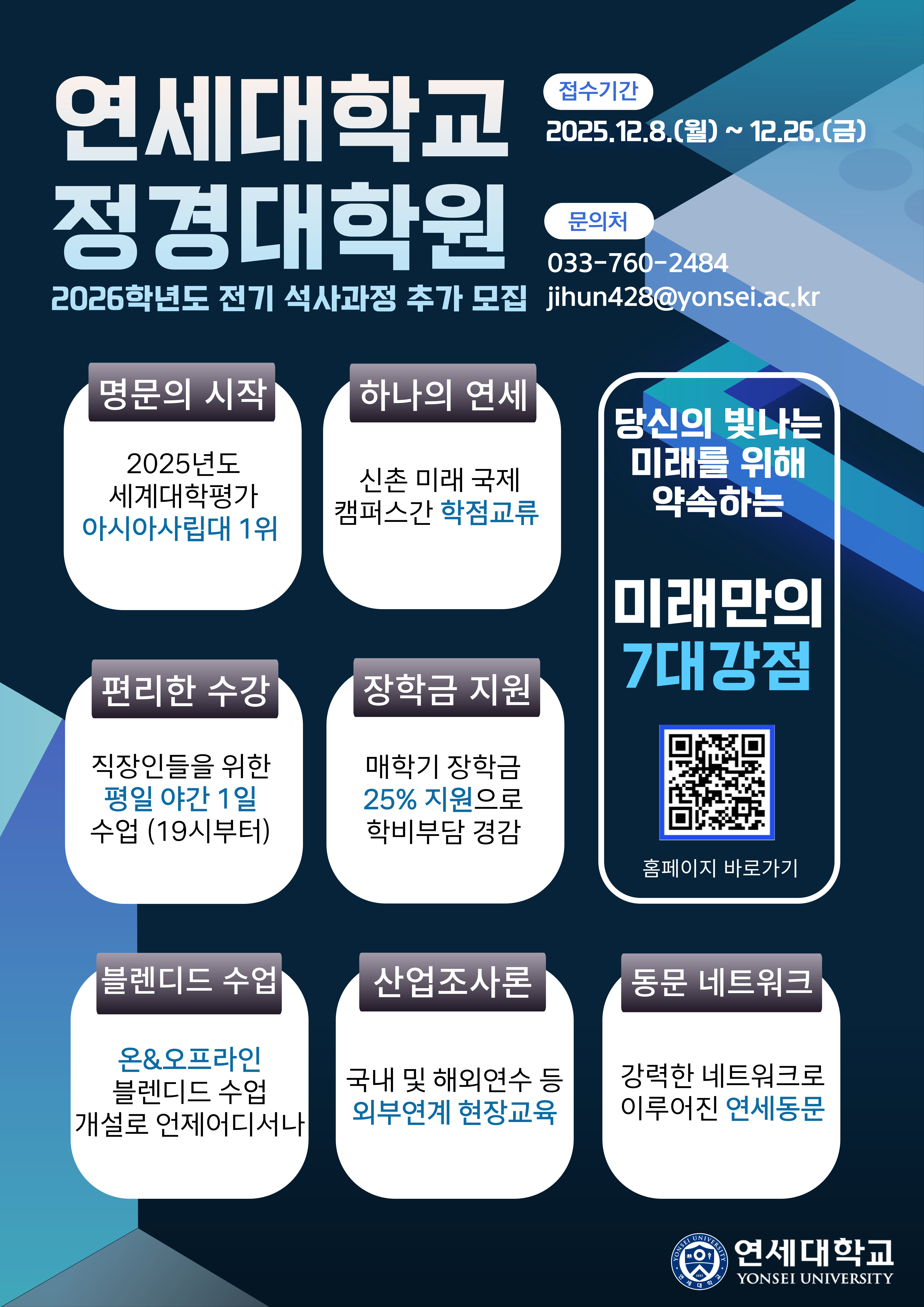* 2026 전기 모집 관련 모집요강 및 전형 안내는 [정경대학원 홈페이지 - 커뮤니티 - 공지사항] 통해서 확인 가능합니다.