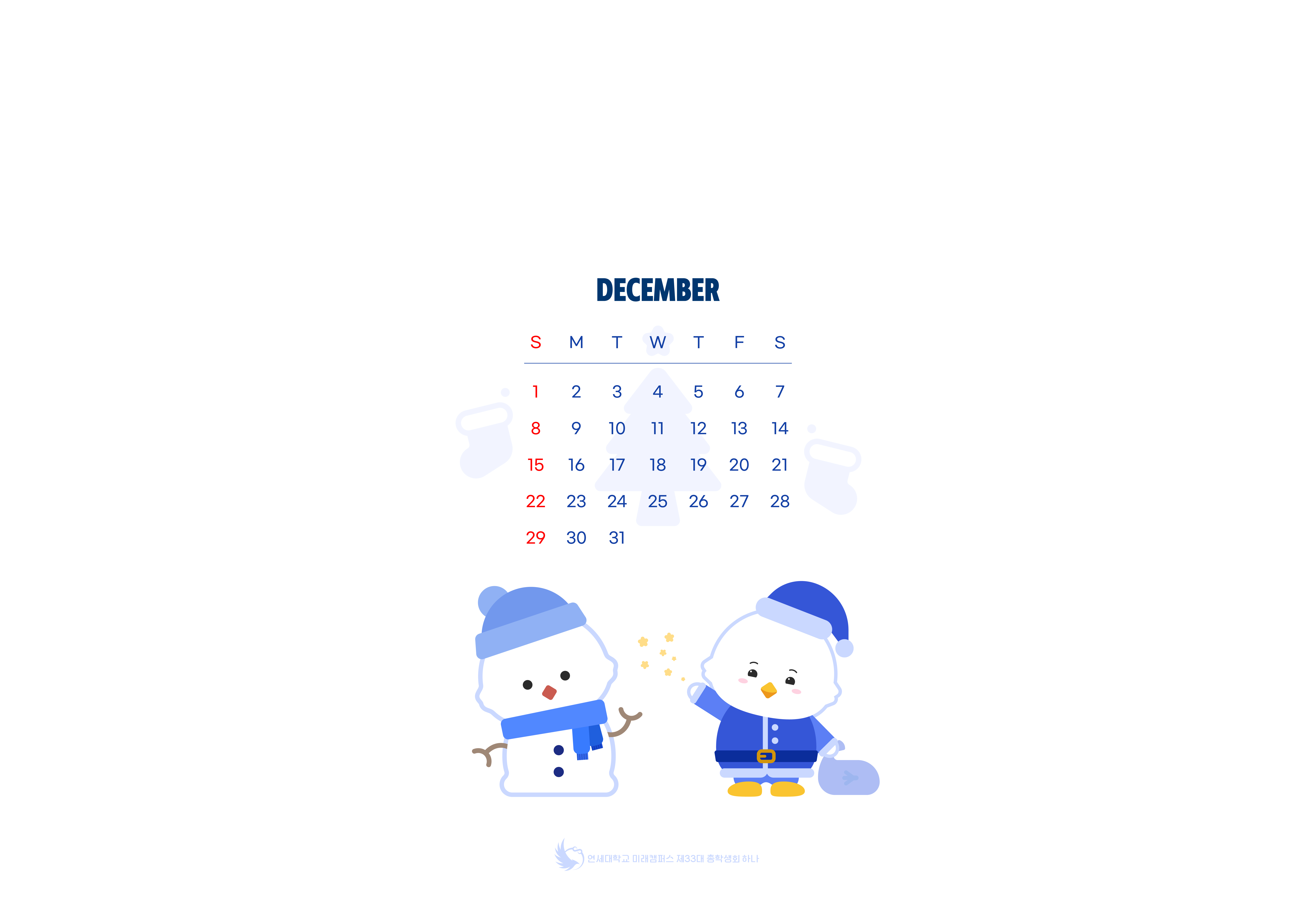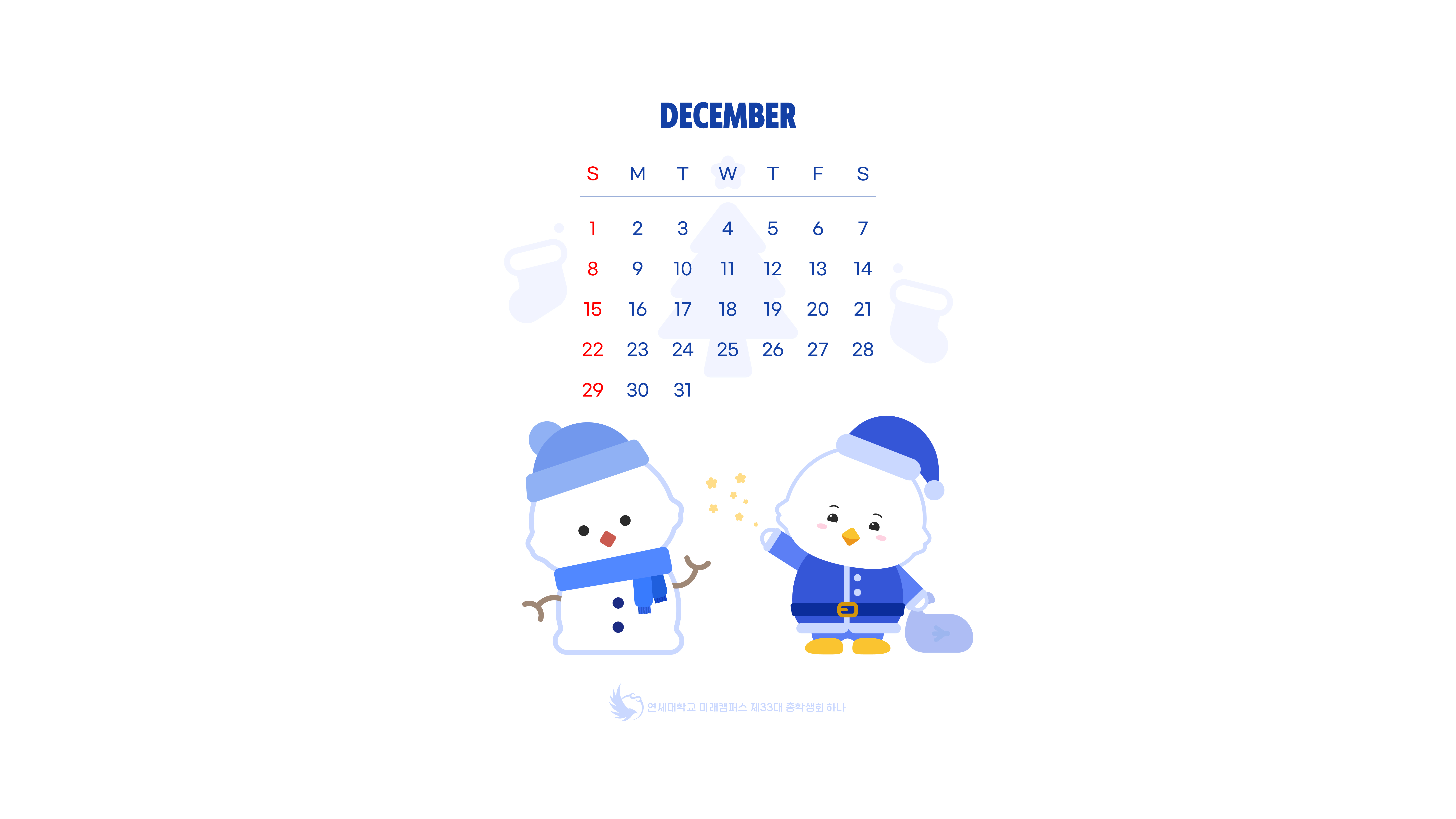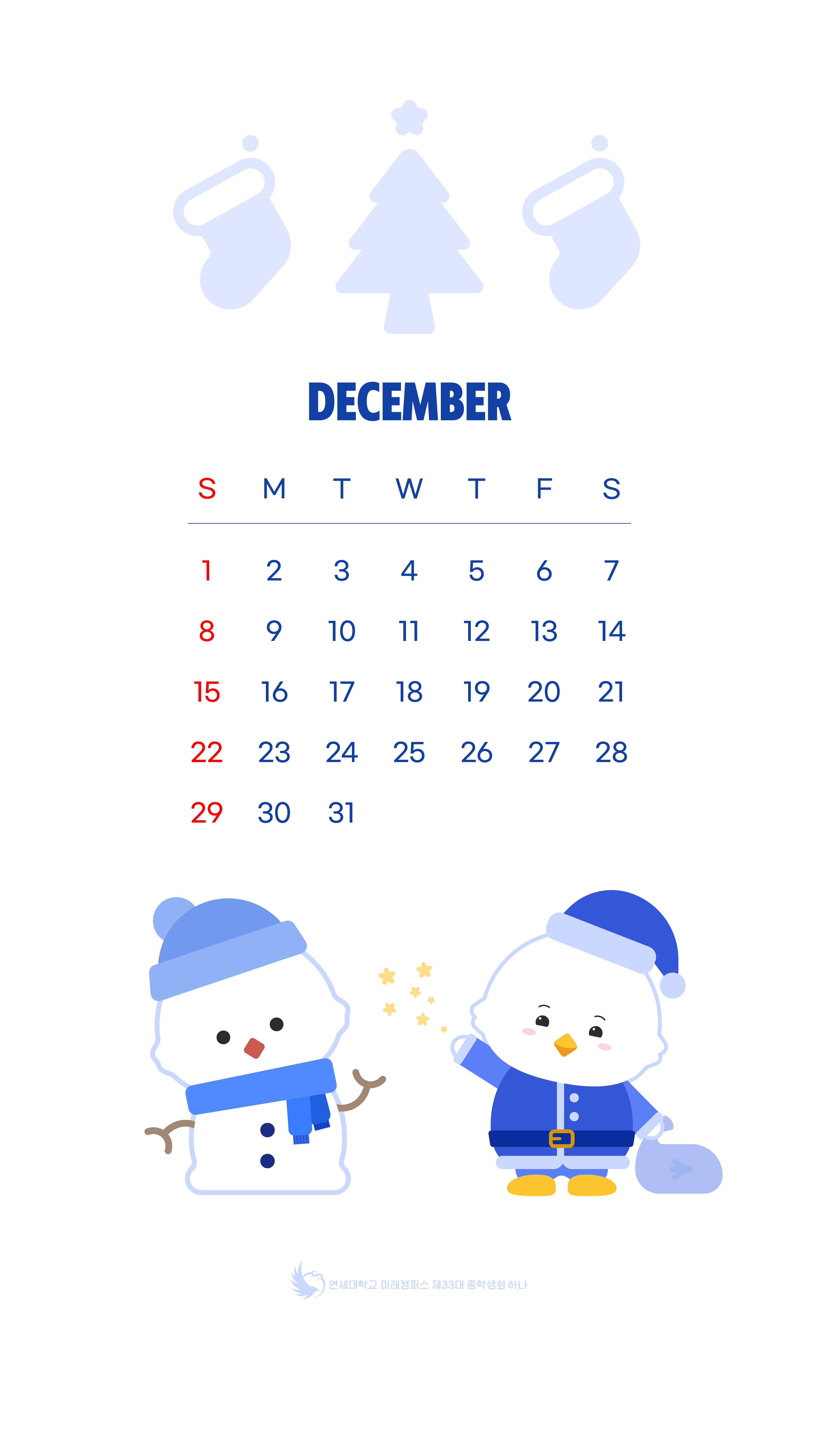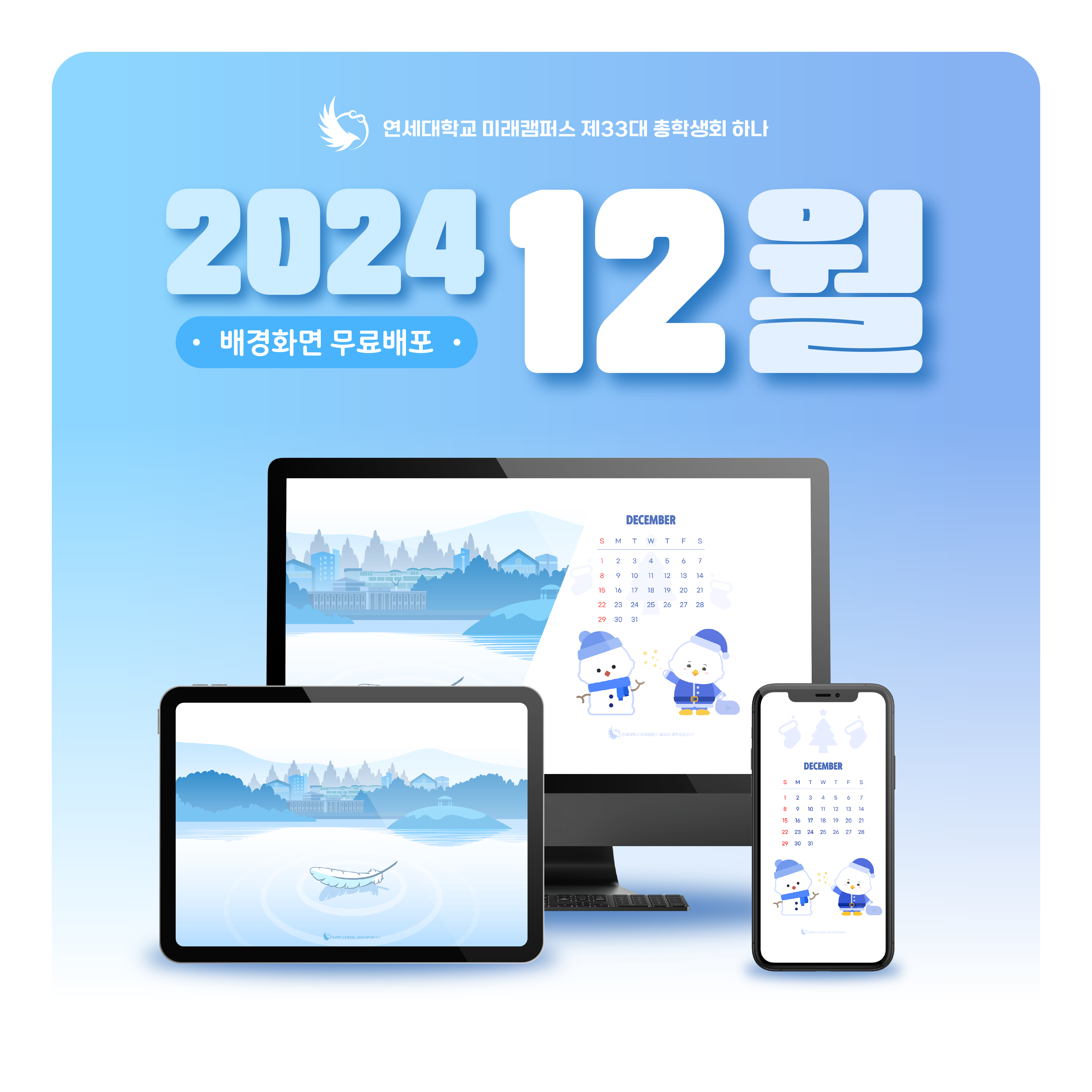 학우 여러분 안녕하십니까. 다시 하나로, 연세대학교 미래캠퍼스 제33대 총학생회 <하나>입니다. 두 가지 테마의 12월 아기수리 배경화면을 공유하니 많은 이용 부탁드립니다 🦅 💙 *PC, 태블릿, 모바일 각각 기기에 맞는 버전으로 다운로드하여 사용하시면 됩니다.