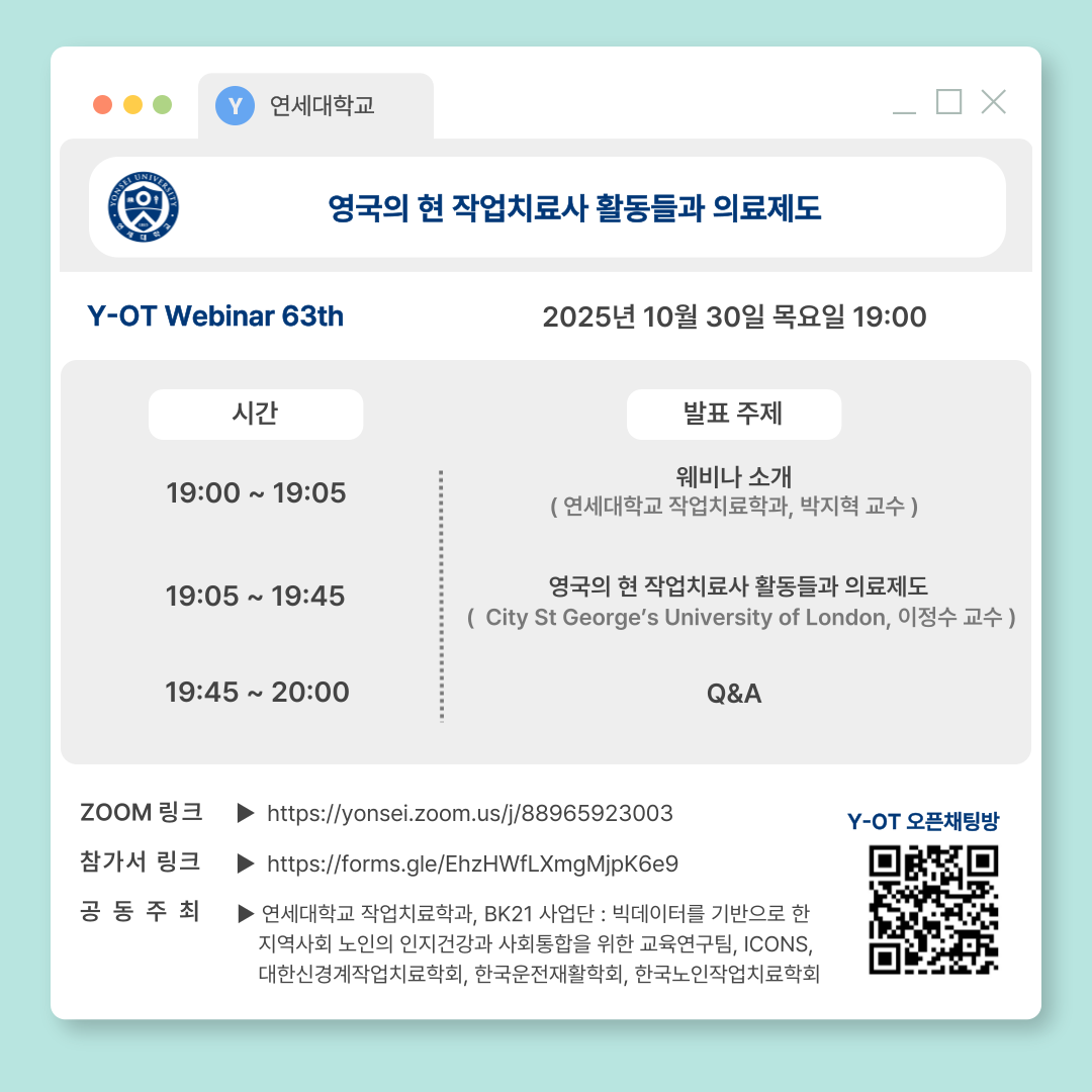 <2025년 10월 제 63회 Y-OT WEBINAR 안내> 안녕하십니까. 제 63회 Y-OT 웨비나 공지드립니다. 주제: 영국의 현 작업치료사 활동들과 의료제도 일시 : 10월 30일 목요일 오후 7시 ※ 이번 웨비나는 기존 수요일에서 목요일로 변경되었습니다. 본 웨비나에 참여를 희망하시는 분들은 아래의 참가신청 작성을 부탁드립니다. 관심 있는 분들의 많은 참여 부탁드립니다. 감사합니다. YOT 오픈채팅방 (비밀번호ysot1234): https://open.kakao.com/o/gOqnnjsc 줌 링크: https://yonsei.zoom.us/j/88965923003 참가서 링크: https://forms.gle/EhzHWfLXmgMjpK6e9