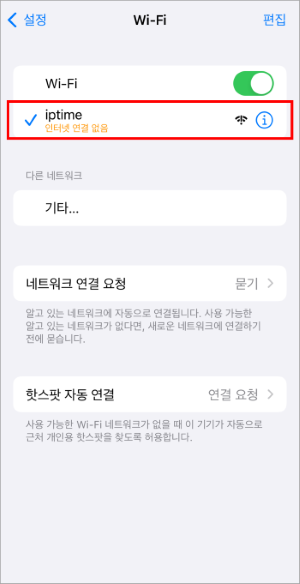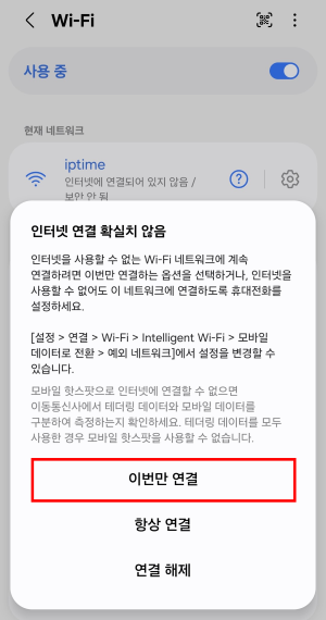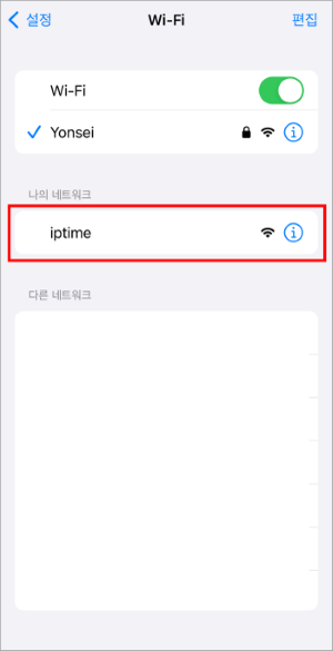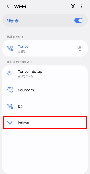 와이파이를 켜고 목록에 iptime이 표시되면 설정을 클릭하고, '이번만 연결'을 선택해주세요.