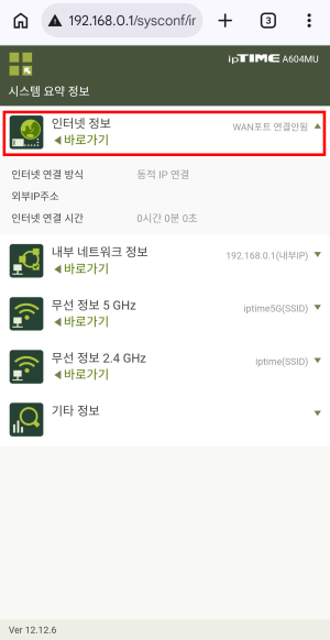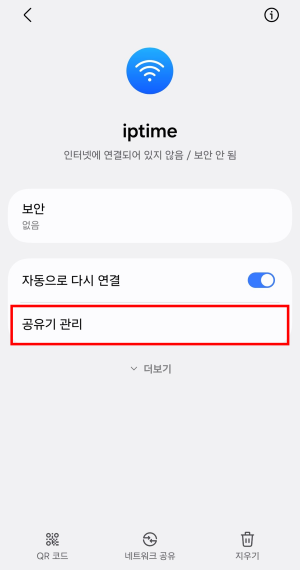 iptime 연결 후, '공유기 관리'를 선택하여 설정 화면으로 이동합니다.