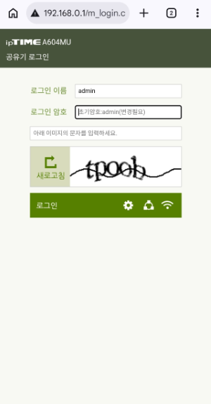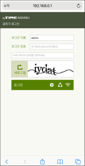 주소창에 192.168.0.1을 입력하여 iptime 공유기 관리자 페이지에 접속합니다.
