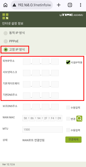 관리도구에 접속하신 후 기본설정 -> 인터넷 연결 설정 -> 고정 IP 사용자 체크.
